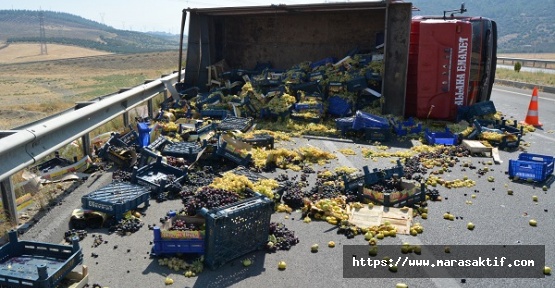Kazada sürücü Diril ile yanında bulunan Enes Baldemir (49) yaralandı, yaklaşık 3 ton üzüm asfalta döküldü.