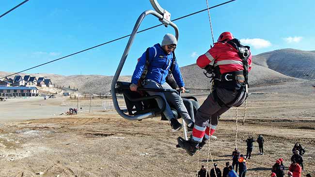 Gerçeği aratmayan tatbikatta ekipler, senaryo gereği telesiyejde mahsur kalan vatandaşları halatlar yardımıyla güvenli bir şekilde yere indirdi.